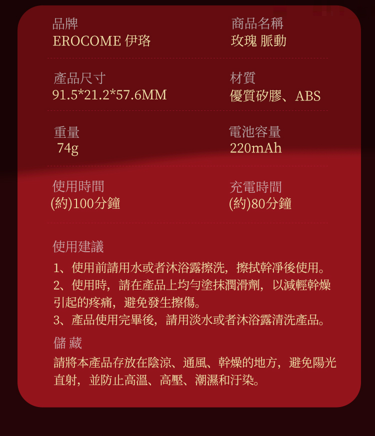 With lifestyle waterproofing and a quiet motor, this vibrator ensures discreet comfort. USB magnetic charging offers 100 minutes of runtime after an 80-minute charge. Its silky-smooth surface and easy finger-grip design make it effortless to use. Includes cable and manual. Made by EROCOME in China, it guarantees quality. Shop now to ignite passion with the EROCOME - Rose Pluse Clit Vibrator!