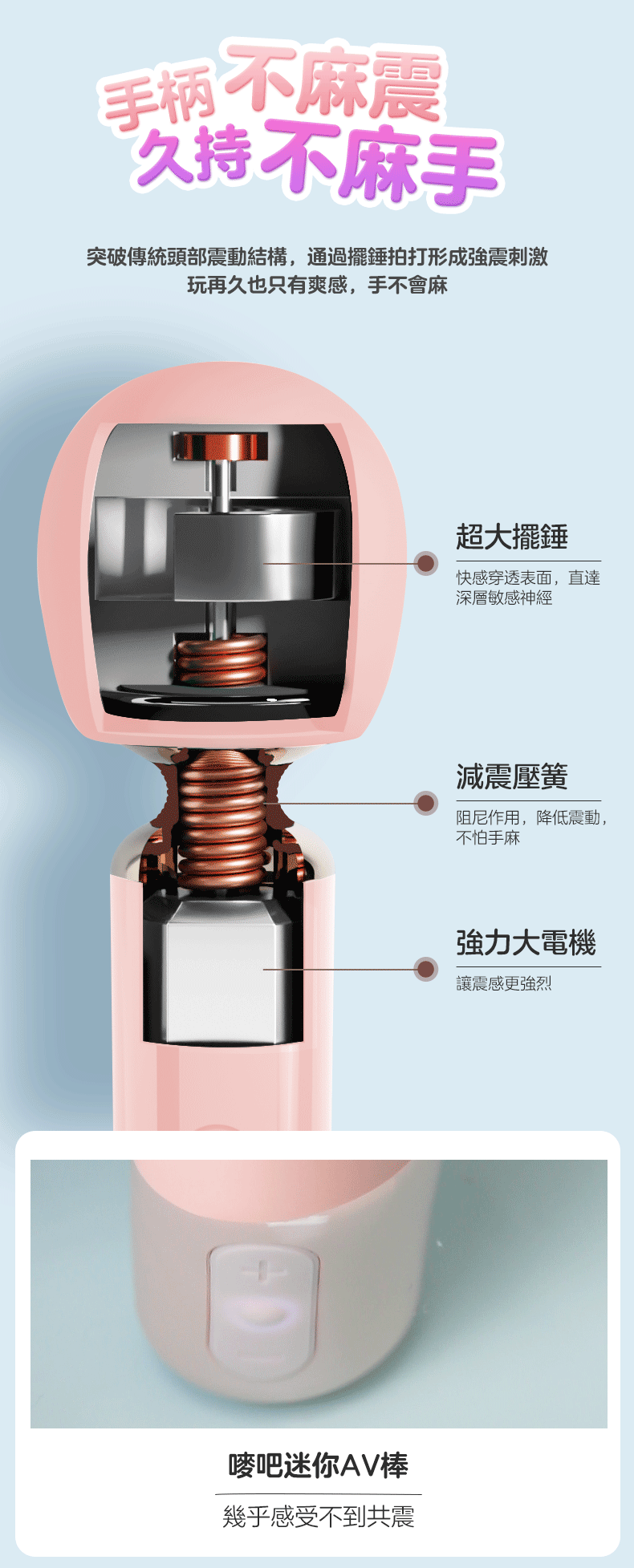 創新的擺錘拍打技術,讓它保持強勁震感的同時,手不會感覺明顯的震感,用的時候只有爽快感,沒有手麻感。
