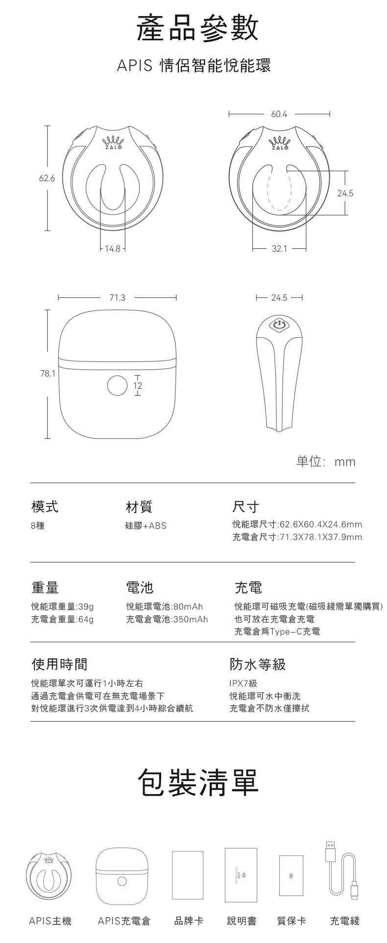 With liquid silicone for a snug fit, IPX7 waterproof main unit for easy cleaning, a charging case doubling as a 5-meter remote, and noise under 40 dB, it offers discreet power. Main unit provides 60 minutes of use, with an extra 240 minutes via the charging case. Packaged in a 110 x 130 x 55mm box weighing 265.8g. Made by ZALO in China, includes ring, case, cable, and manual. Shop now to ignite passion with the ZALO - Apis Portable APP-Controlled Couples Vibrating Cock Ring!