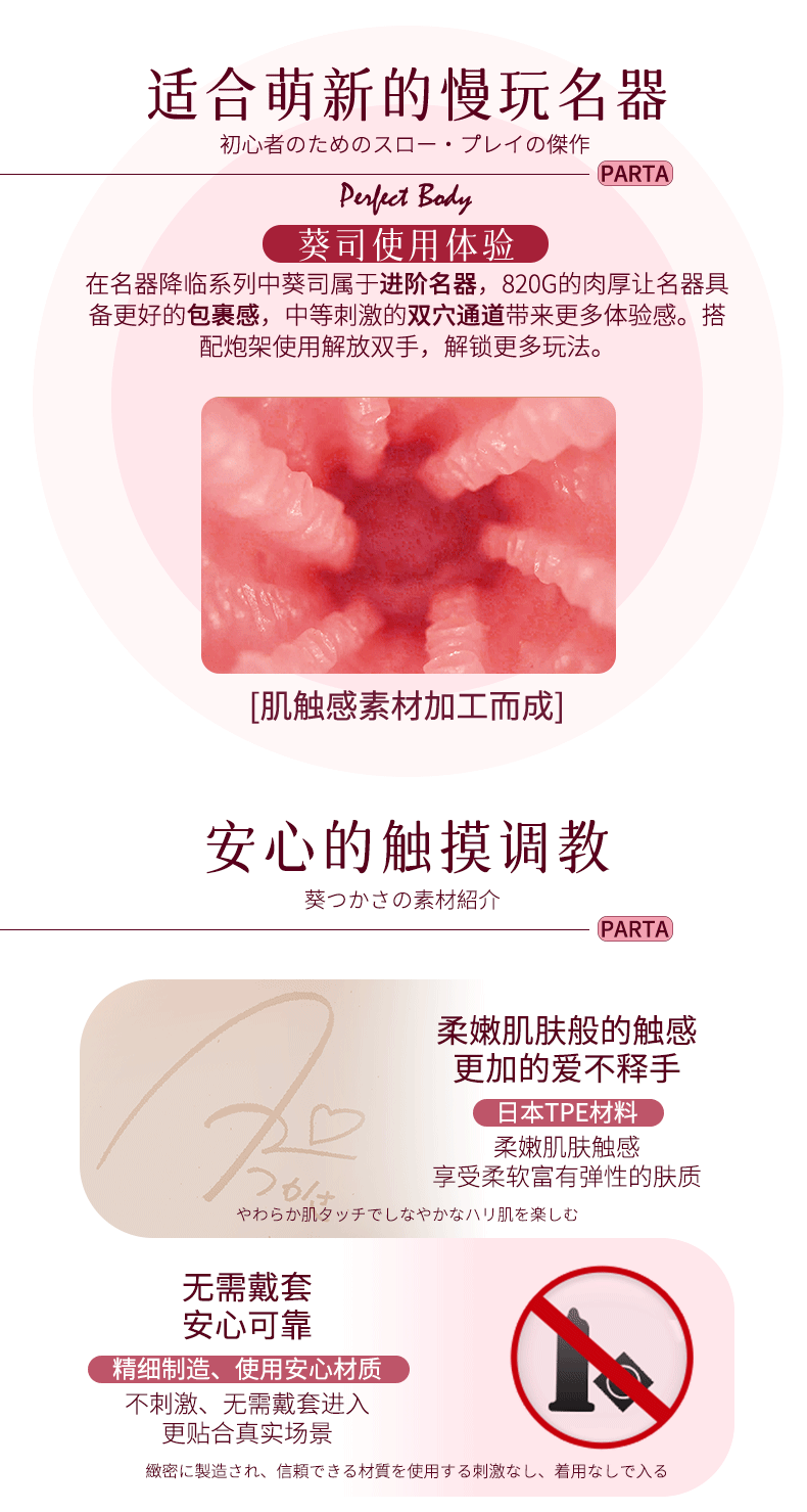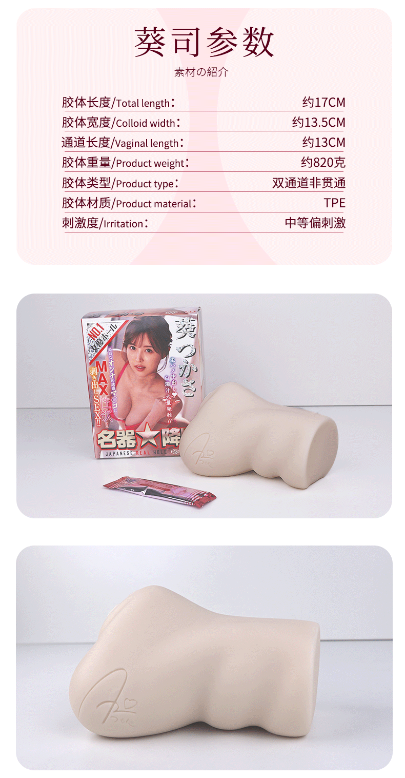 在名器降臨系列中葵司屬於進階名器,820G 肉厚讓名器具備更好的包裹感,中等刺激的雙穴通道帶來更多體驗感,解鎖更多玩法。