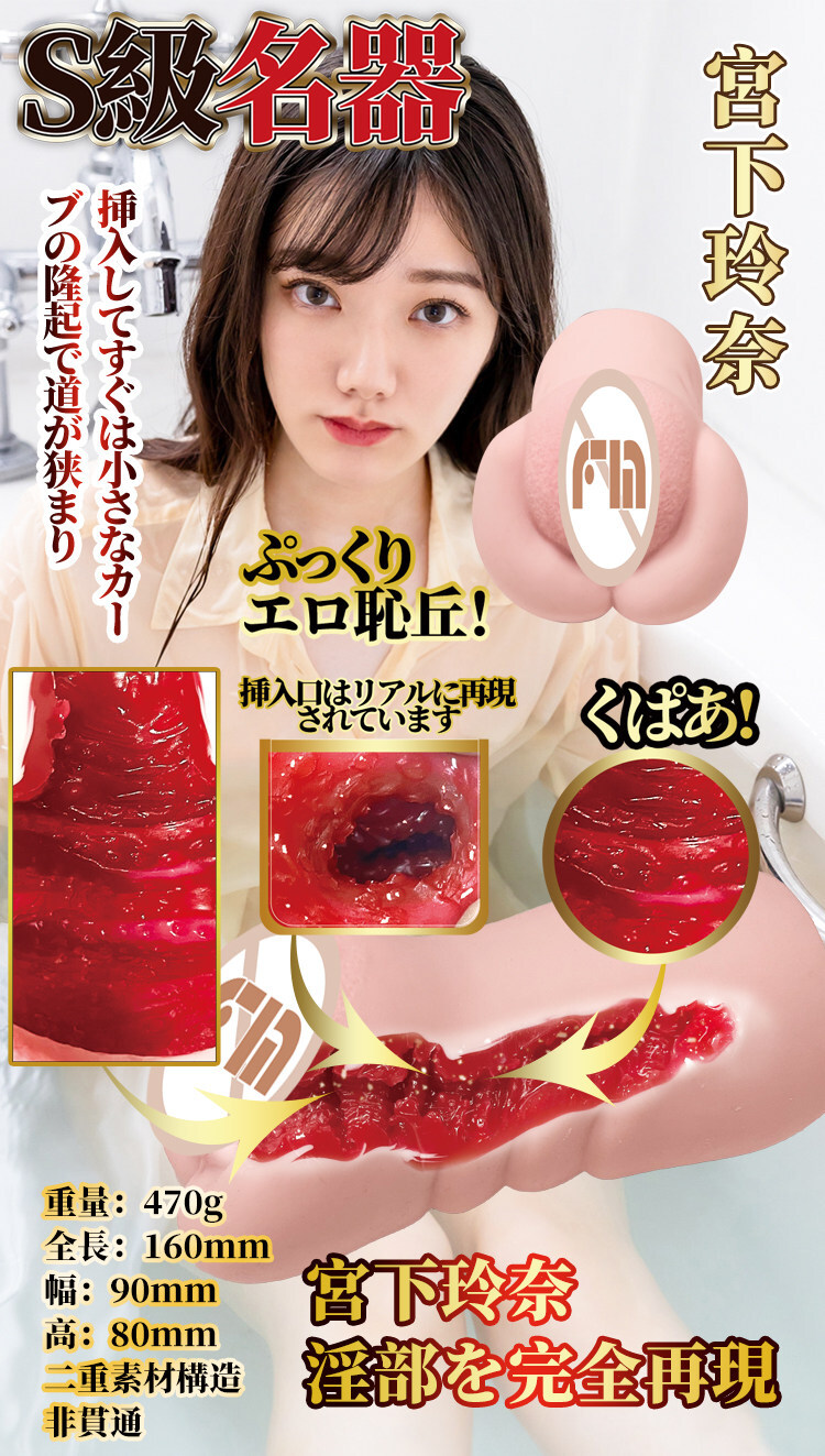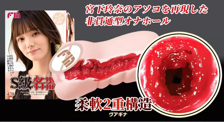 FM - S 級名器 肉慾覺醒 宮下玲奈名器,TPE 雙層構造、非貫通通道長 138 mm,重量約 470 g,沉浸式女優級包裹與吸力體驗。