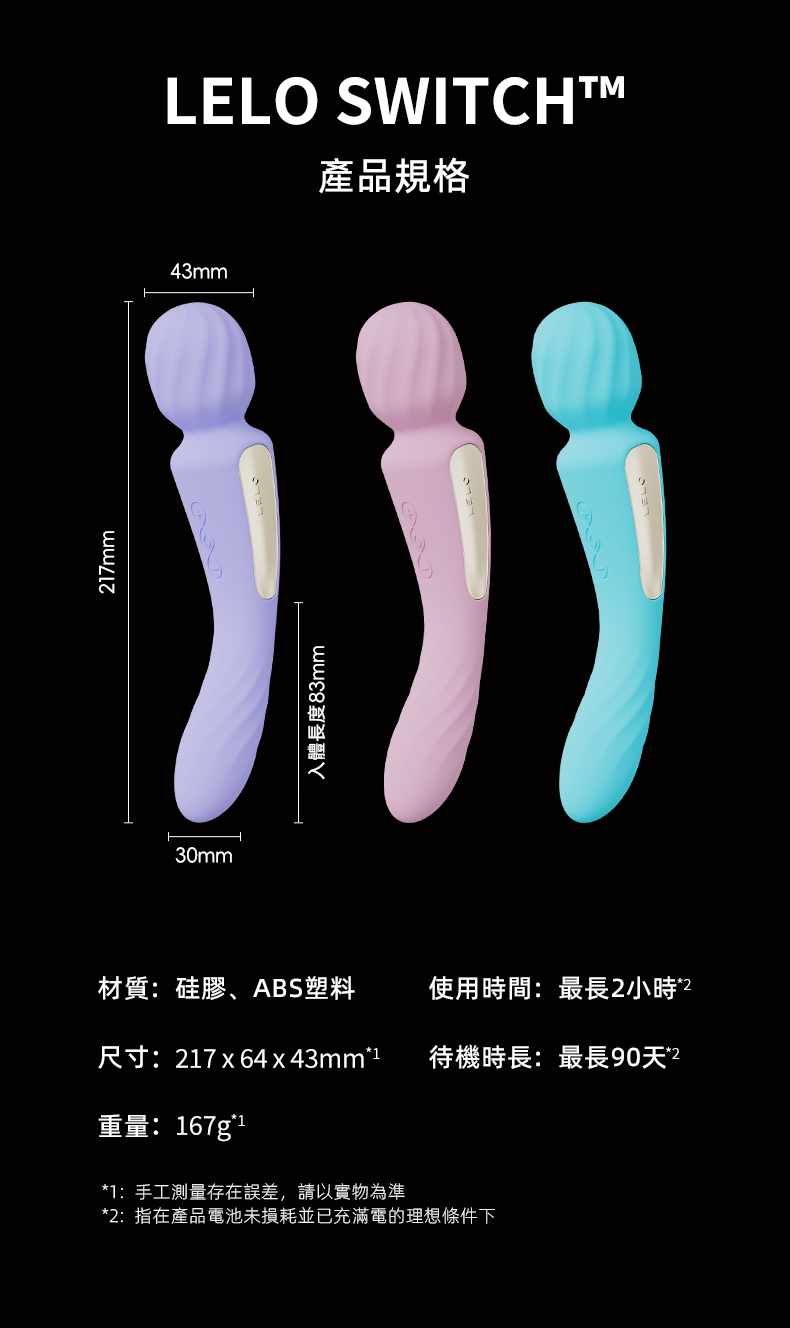 217 x 64 x 43 mm,167 g 輕盈設計,IPX7 防水等級,安全矽膠與 ABS 塑料材質,天鵝絨般柔滑觸感。透過 LELO 應用程式藍牙控制,提供 10 種內建模式與 2 種專屬模式( FINISH ME OFF 與 OUT OF CONTROL ),16 檔強度隨心調節。Love Bridge 功能讓您與伴侶遠距互控,增添情趣。90 天待機,120 分鐘充電可使用 120 分鐘,聲量低於 63 dB,提供淡粉色、丁香紫、水藍色三色選擇。隨附緞面收納袋與 USB 充電線,12 個月保養期。立即選購,體驗 LELO Switch™ 的奢華快感!