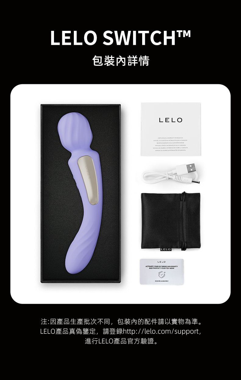 產品包括 LELO SWITCH™、USB 充電線、緞面收納袋、保固登記卡、詳細使用說明書