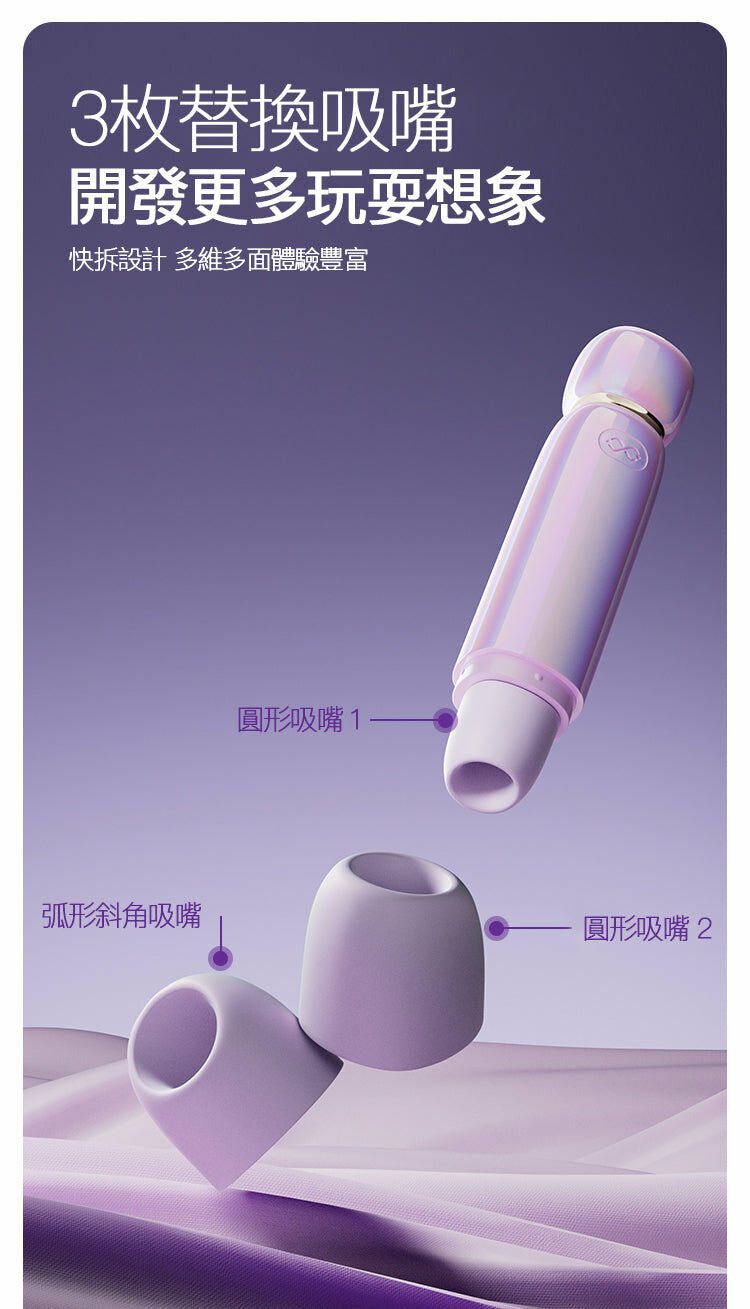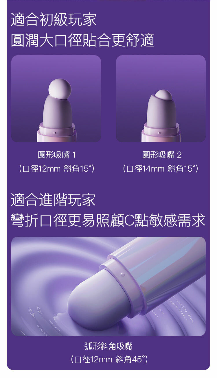 配備三個可更換吸頭,讓您拓展情趣的想像力,快拆設計則讓體驗更加豐富。圓形吸頭的設計非常適合初學者,光滑的大直徑設計確保舒適貼合。而對於進階使用者,具有角度的直徑能更好地解決 C 點的靈敏度問題。