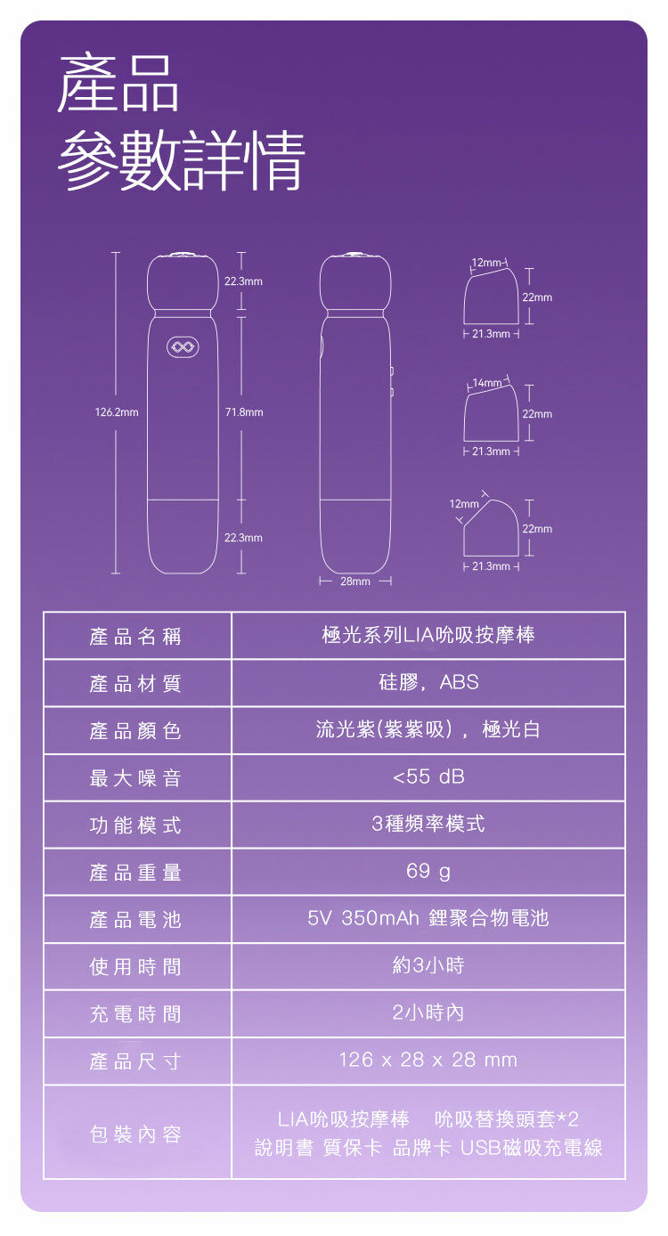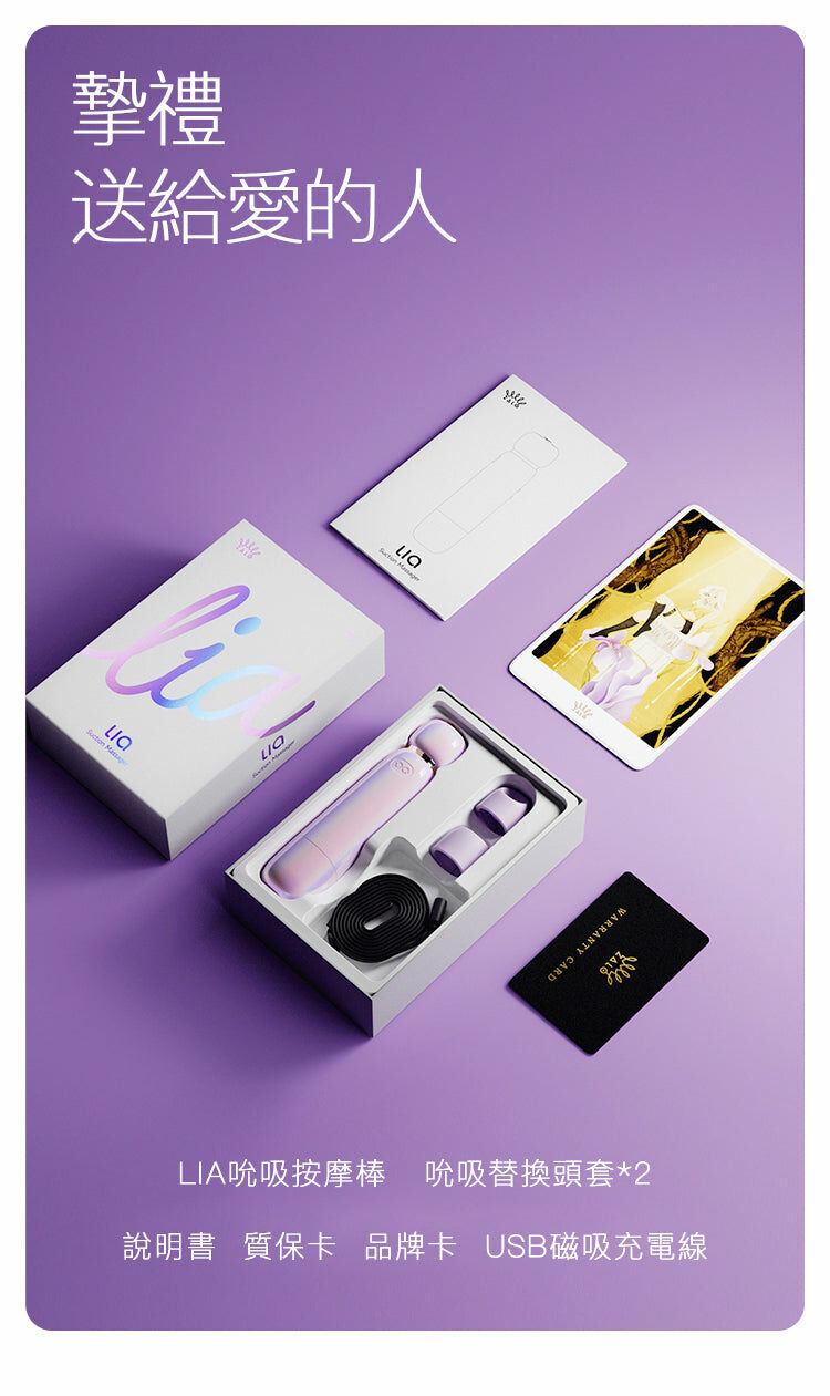 這款 Lia 以無段調速的輕柔吸力,無裝備限制,即時變速,讓您在每一次的使用中都能體驗到不同的快感。其虹彩漸層珠光色外觀優雅,提升了私密性,並且便於收納。