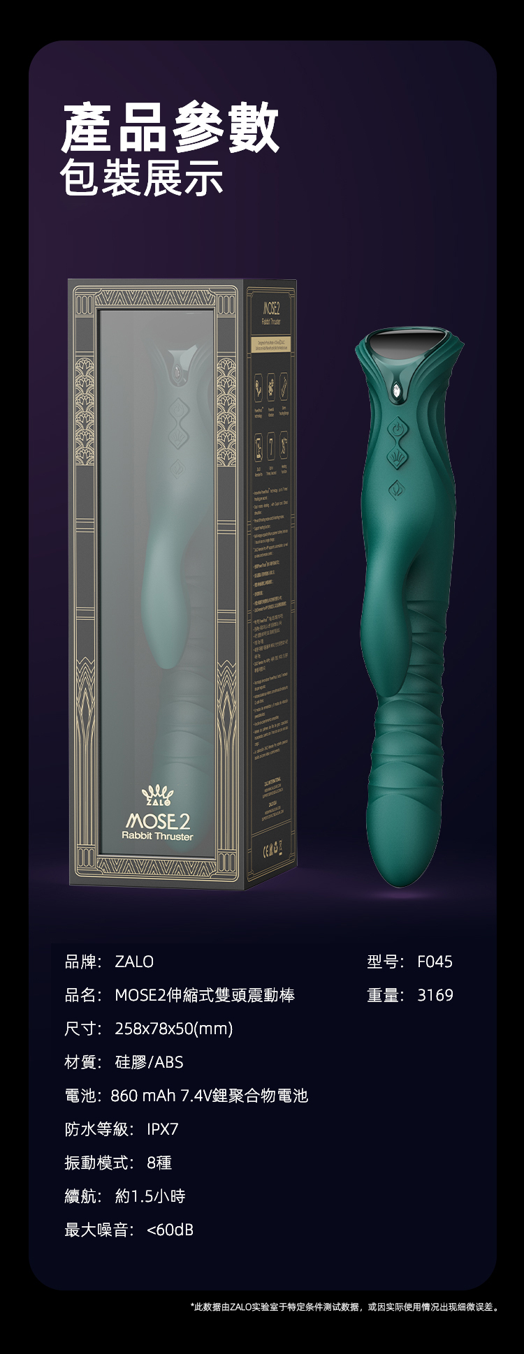 With 15mm thrusting depth, dual motors for G-spot and clitoral stimulation, 43°C heating, and an LED smart screen, it offers seamless control. Waterproof for easy cleaning, under 50 dB noise, and magnetic USB charging for 120 minutes of use. Packaged in a 285 x 86 x 90mm box weighing 660.7g, includes cable and manual. Made by ZALO in China. Shop now to ignite passion with the ZALO - Mose 2 Heated Thrusting Dual-Head Vibrator!