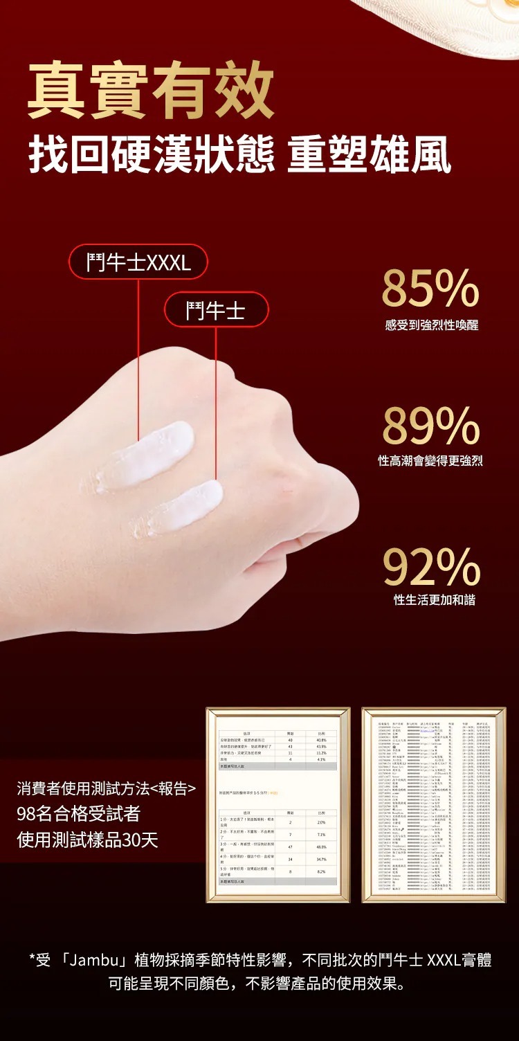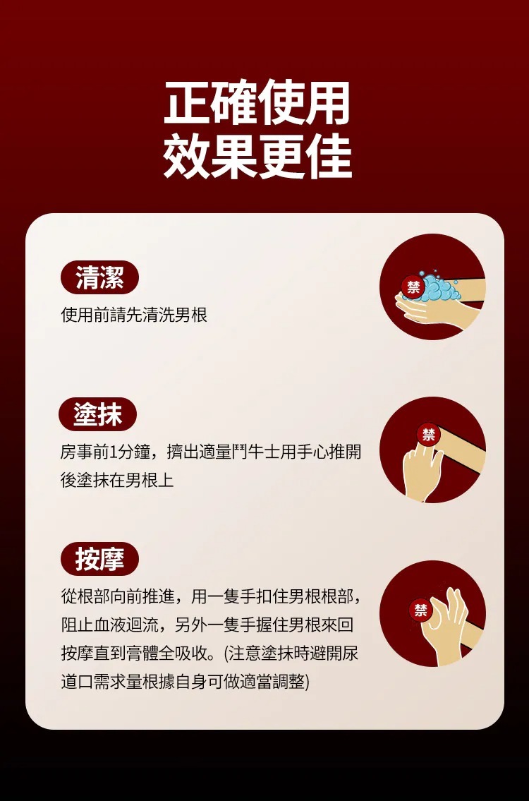 | 主要成份 | Touro:水、甘油、人蔘、牛磺酸、甜杏仁油等 Touro XXXL:水、甘油、人蔘、牛磺酸、乳木果油等 |