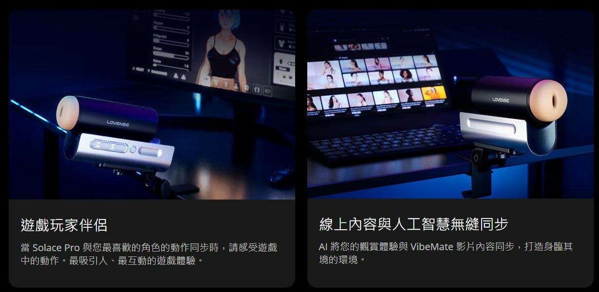 LOVENSE 推出新型旗艦人工智慧輔助 男性電動飛機杯 Solace Pro,具有強大的 AI 互動。此新型號包括一個飛機杯和一個電子行程部分,使飛機杯前後移動。透過這款設備,使其與 Lovense AI Sync 瀏覽器應用程式相容。