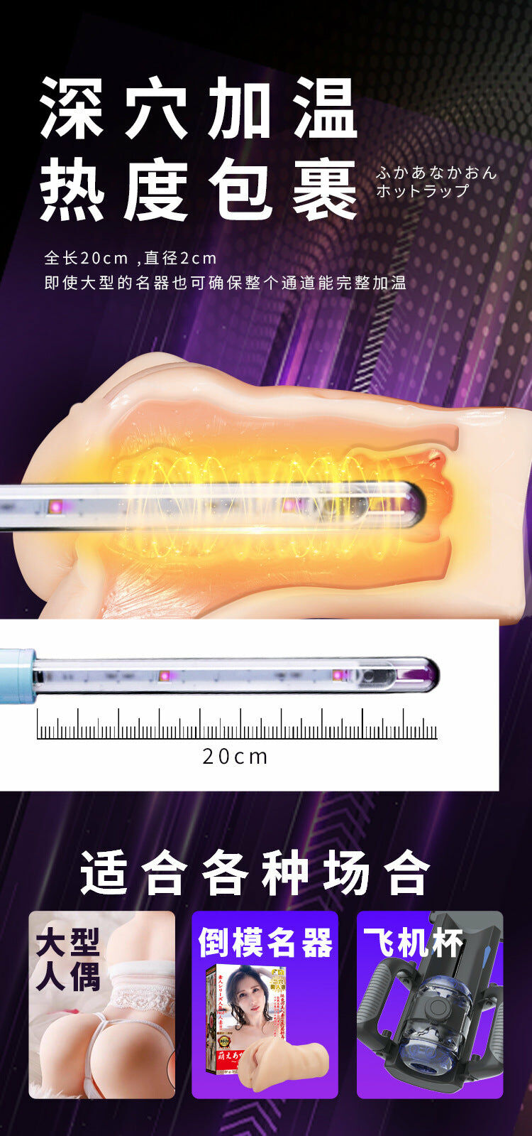 全長 20 cm,直徑 2 cm。即使大型名器也可確保整個通道能完整加溫。