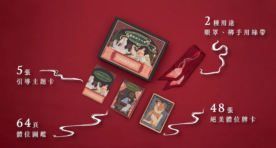 | 產品包括 | 48 張體位卡、5 張引導主題卡、64 頁體位圖鑑、眼罩綁手兩用絲巾 |