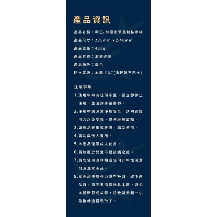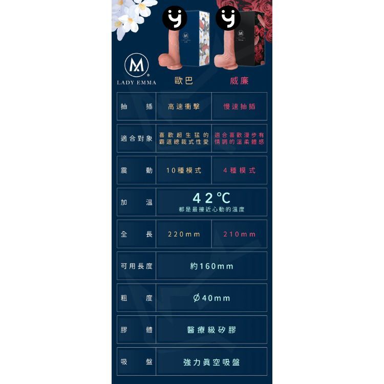 自動衝擊超高速,120% 還原被歐巴猛撞的真實體感! LADY EMMA 歐巴 加溫衝擊震動假陽具,醫療級矽膠超柔軟,尺寸約 220 × Ø40 mm,可插入約 160 mm,重量約 420 g,強力真空吸盤固定,IPX7 防水(遙控器除外),USB 磁吸充電約 120 分鐘享約 60 分鐘續航。