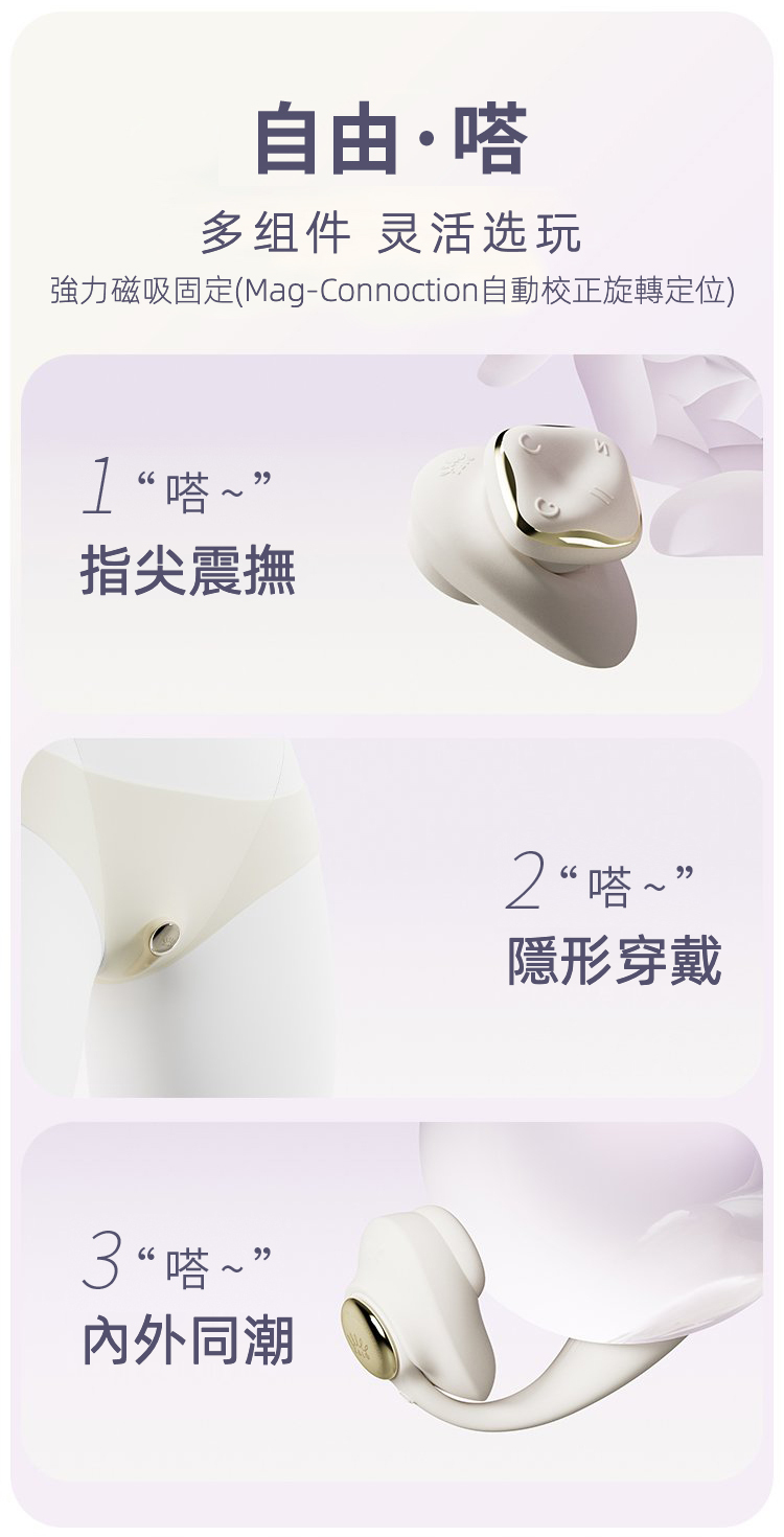 • 跳蛋可單獨穿戴:或組合吮吸/震動頭,磁吸固定更穩固,Mag-Connection 自動校正旋轉定位
