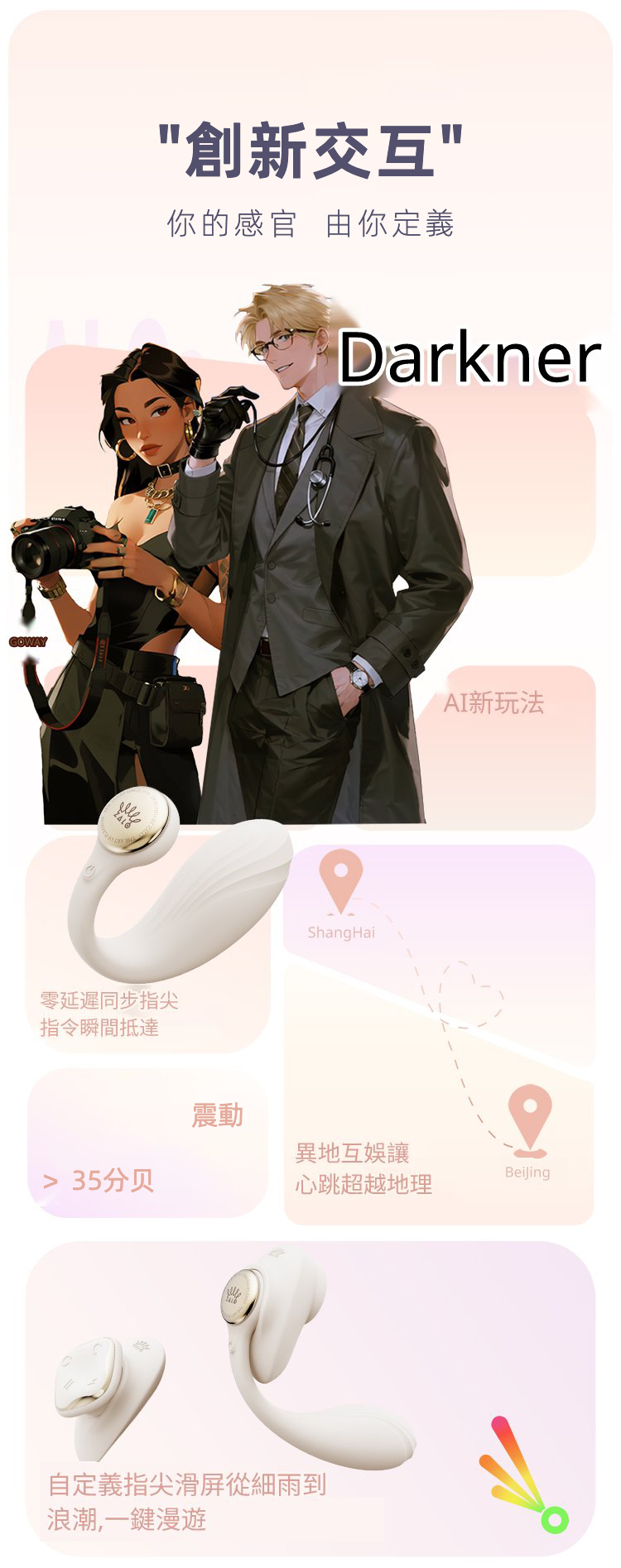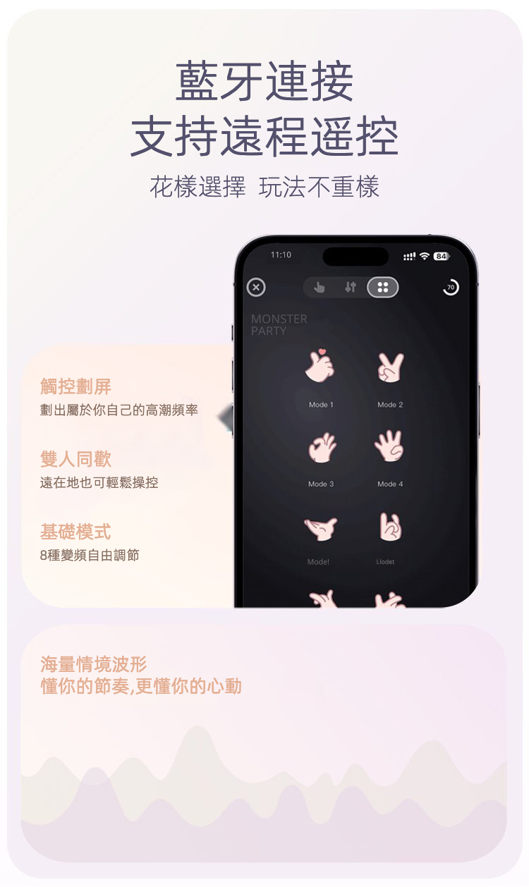 • AI 虛擬伴侶+遠距零延遲:APP 觸控劃屏,自定義波形,一鍵升溫超刺激