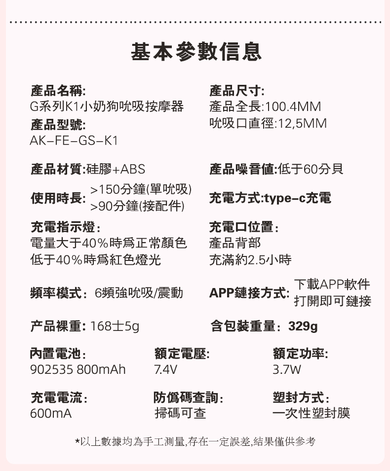 | 運作時間 (mins) | 150(連接按摩棒:90) |
