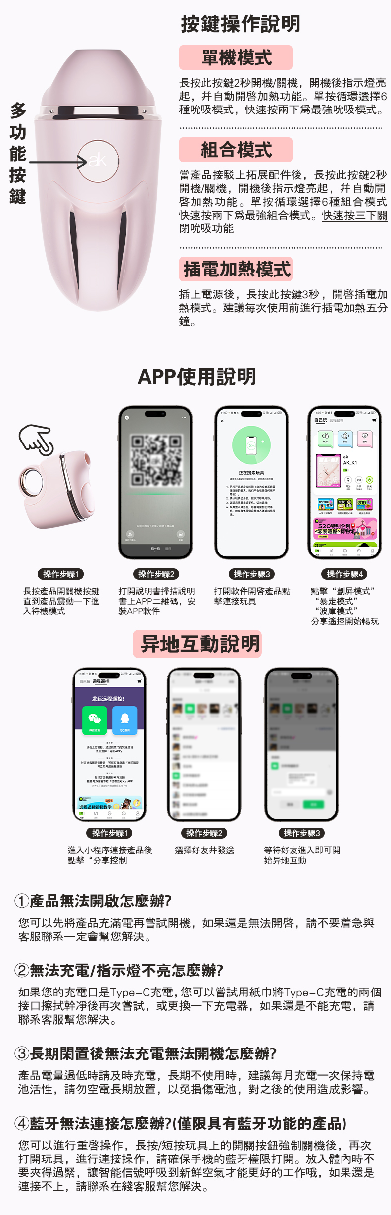準備探索私密與便捷的快感?AK - K1 遠程遙控小奶狗 迷你陰蒂吸啜震動按摩器為一機兩用注入精巧魅力!採用 ABS、POM 與矽膠材質,重量僅 165g,尺寸 104 x 85 x 24mm,結合陰蒂吸啜、抽插與加溫功能,搭載 APP 遠程操控,完美適合居家或旅行中的私密享受!