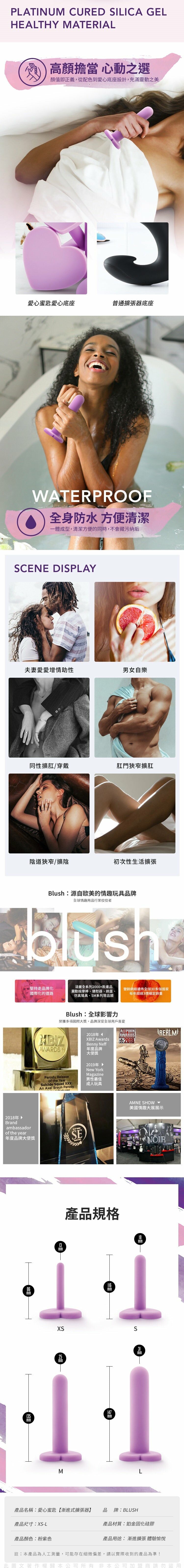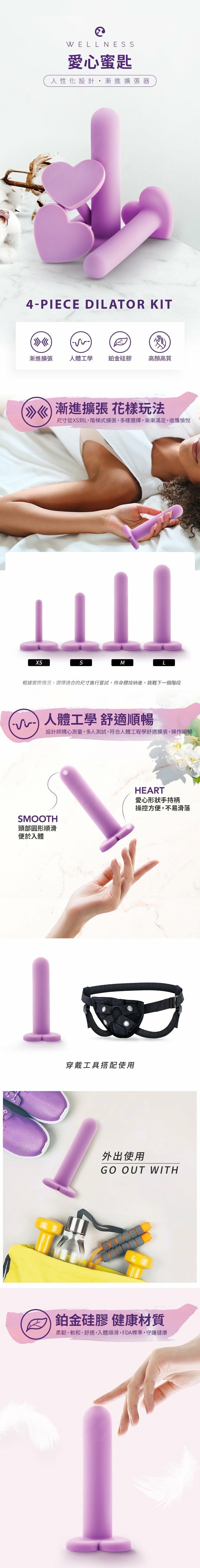 有 4 個不同尺寸的擴張器,起始寬度僅為1.3厘米,讓您可以從小處開始,並在您準備好時向上移動。這些擴張器的心形底座很可愛!配合優質水基潤滑劑一起使用,更容易插入。