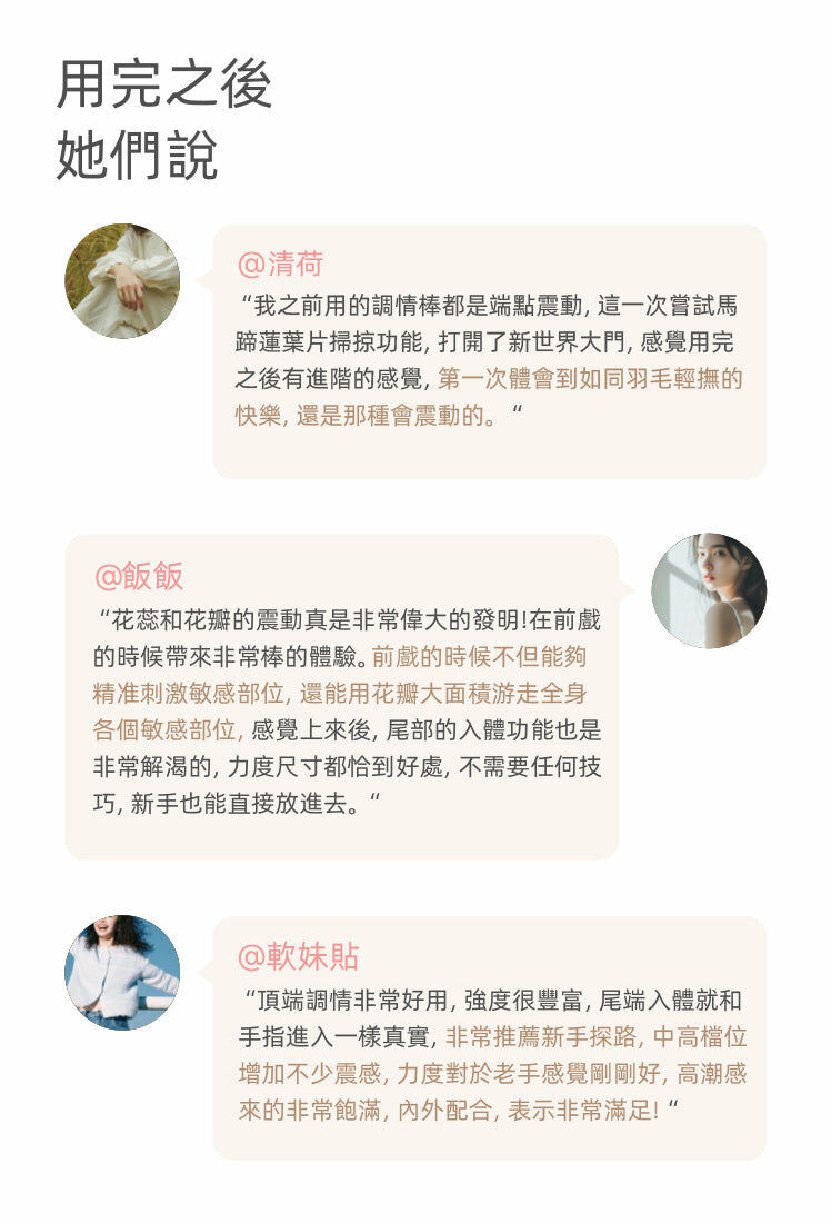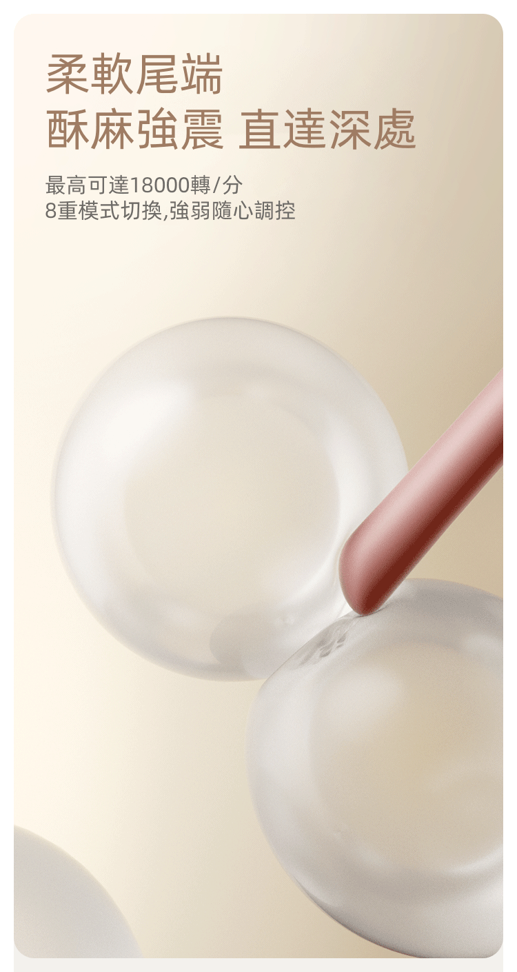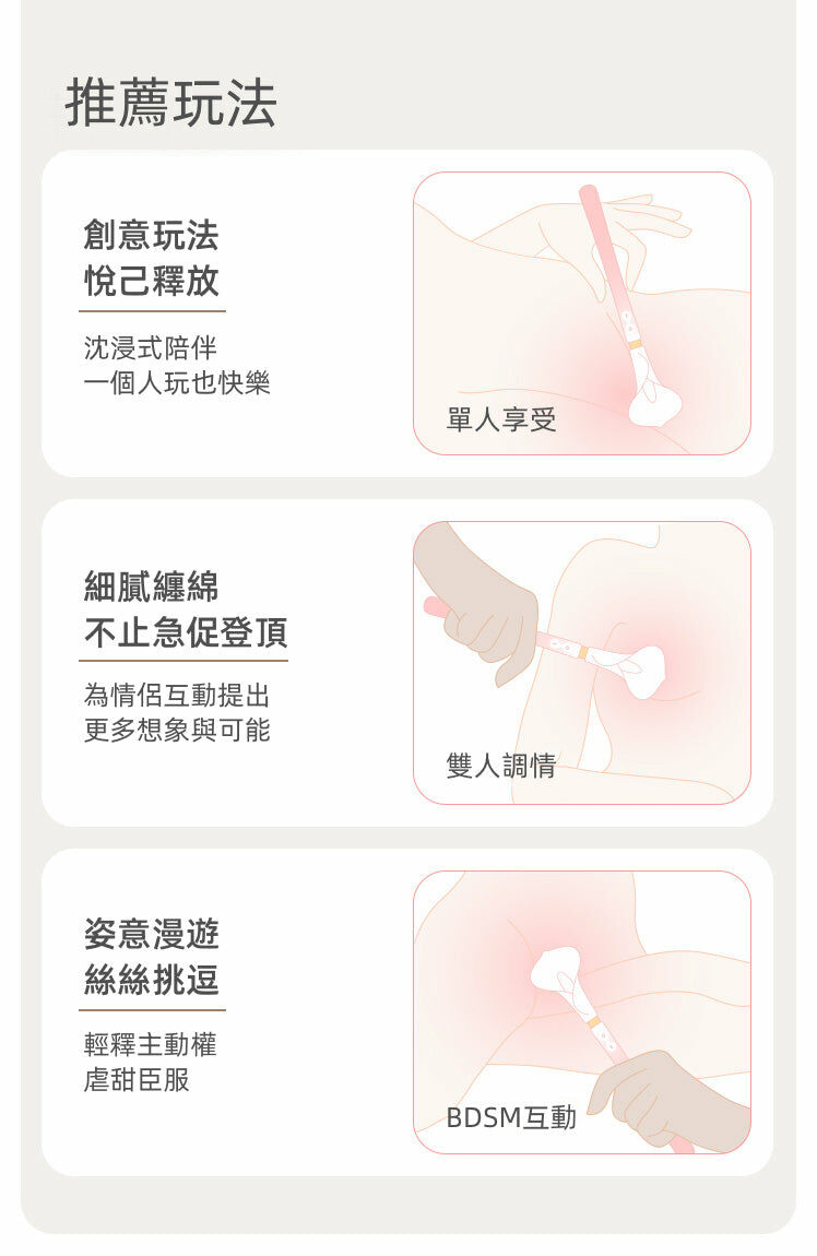產品具備 G 點酥麻強震的功能,能夠拂掠全身,實現大面積的覆蓋掃掠。採用軟糯材質,觸感親膚而細膩,深入探索的尺寸達 10 cm,讓每一次使用都充滿期待。此外,IPX7 級的防水設計使其一沖即淨,讓清潔變得輕鬆而便利。