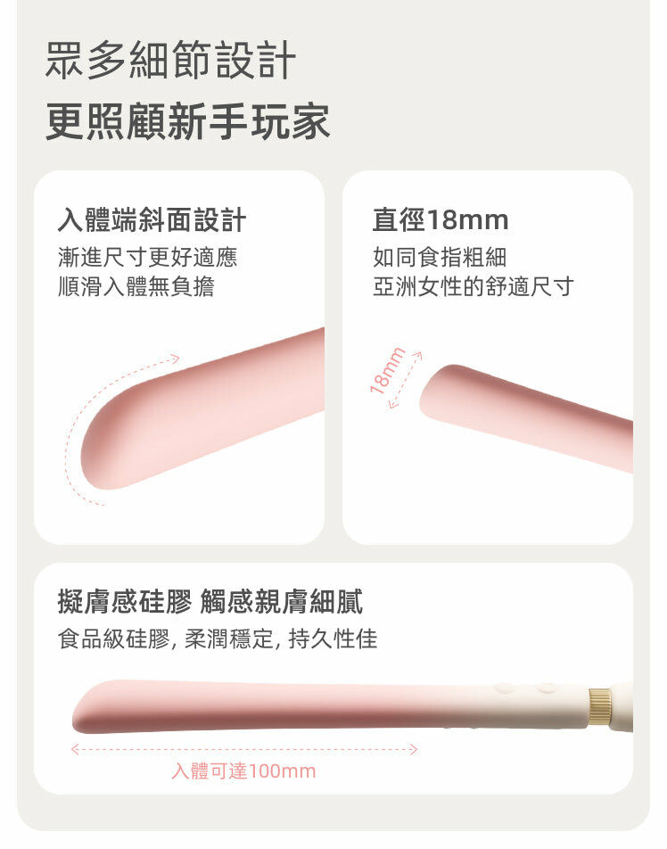 入體端的斜面設計和漸進尺寸,讓使用者能夠輕鬆適應,順滑入體無負擔。直徑 18 mm 的設計如同食指粗細,非常符合亞洲女性的舒適需求。產品採用擬膚感矽膠,觸感親膚且細膩,食品級矽膠的柔潤穩定性也確保了持久性,入體深度可達 100 mm,為您帶來極致的享受。