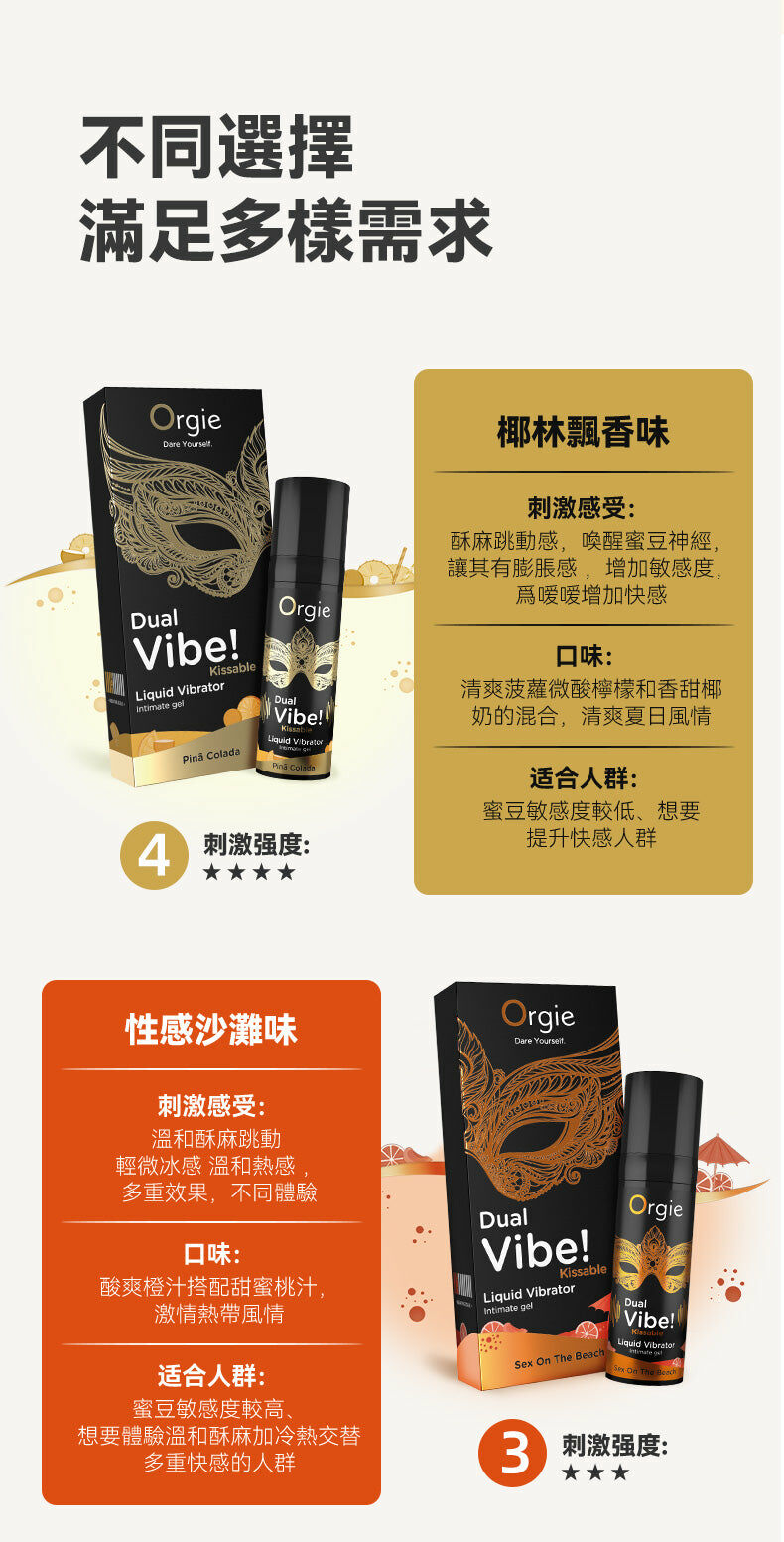 ORGIE Dual Vibe 從經典雞尾酒的熱帶魅力中汲取靈感!椰林飄香為親密時刻帶來一絲精緻。其精心調製的椰林飄香雞尾酒口味旨在刺激味蕾,而溫和但非常令人滿意的酥麻震感效果為口交增添了額外的興奮感,使其更加舒適和愉悅。