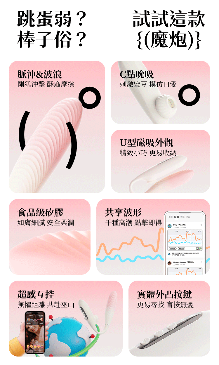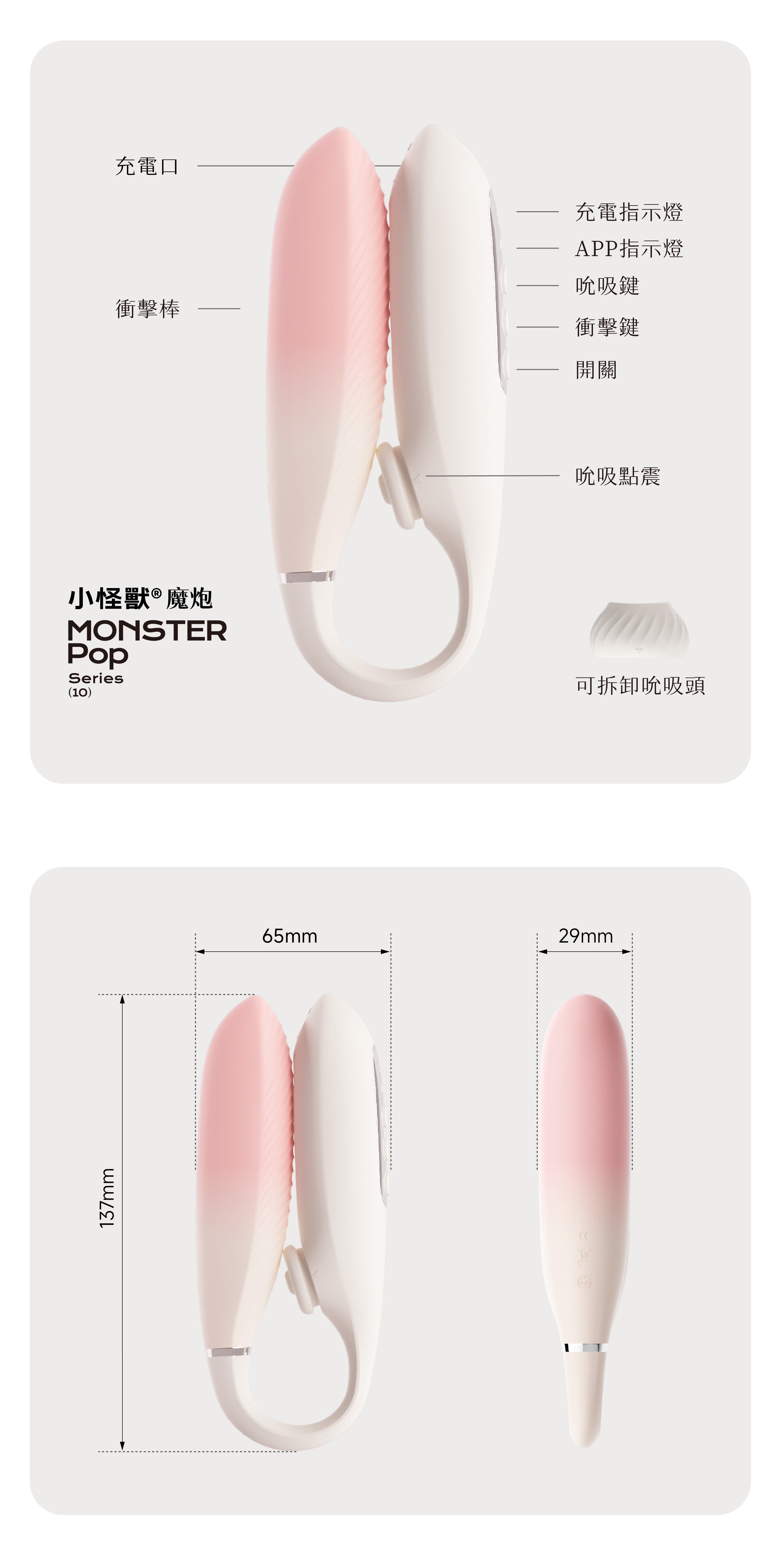 準備體驗多重快感衝擊?SISTALK 小怪獸 - 魔炮按摩棒為按摩棒注入創新樂趣!採用固態矽膠,重量僅 209g,尺寸 137 x 65 x 29mm,結合吸啜、拍打與抽插功能,搭載 Monster Pub APP 遠程操控,無論獨享或情侶共享,都能打造專屬快感節奏!
