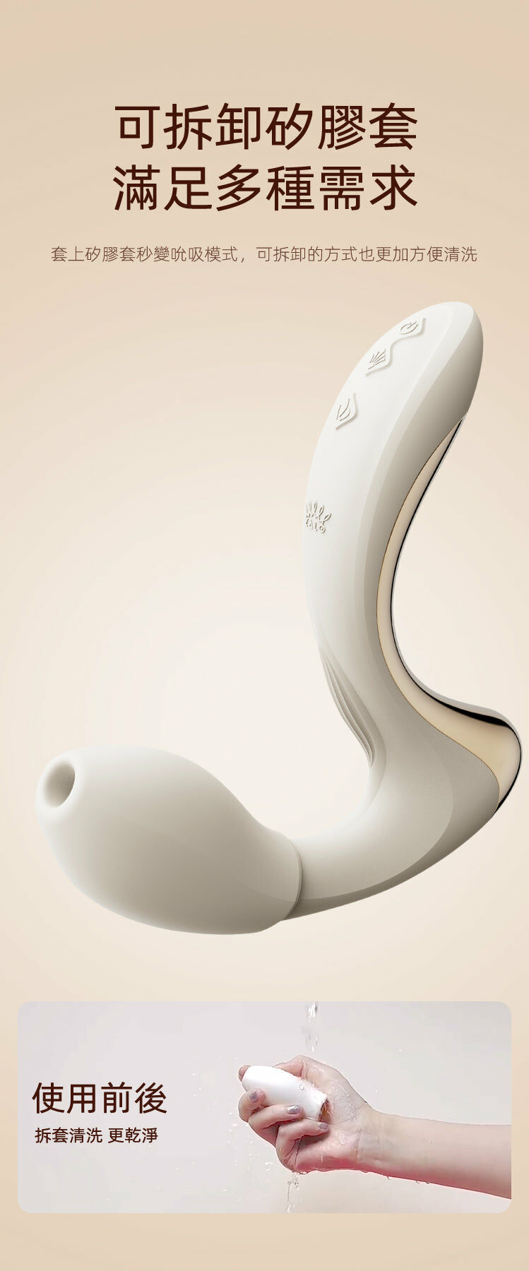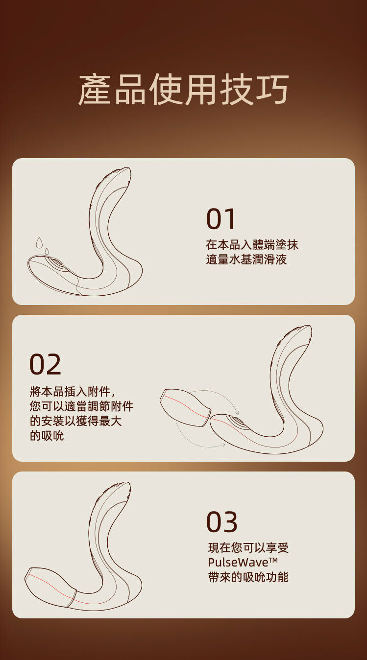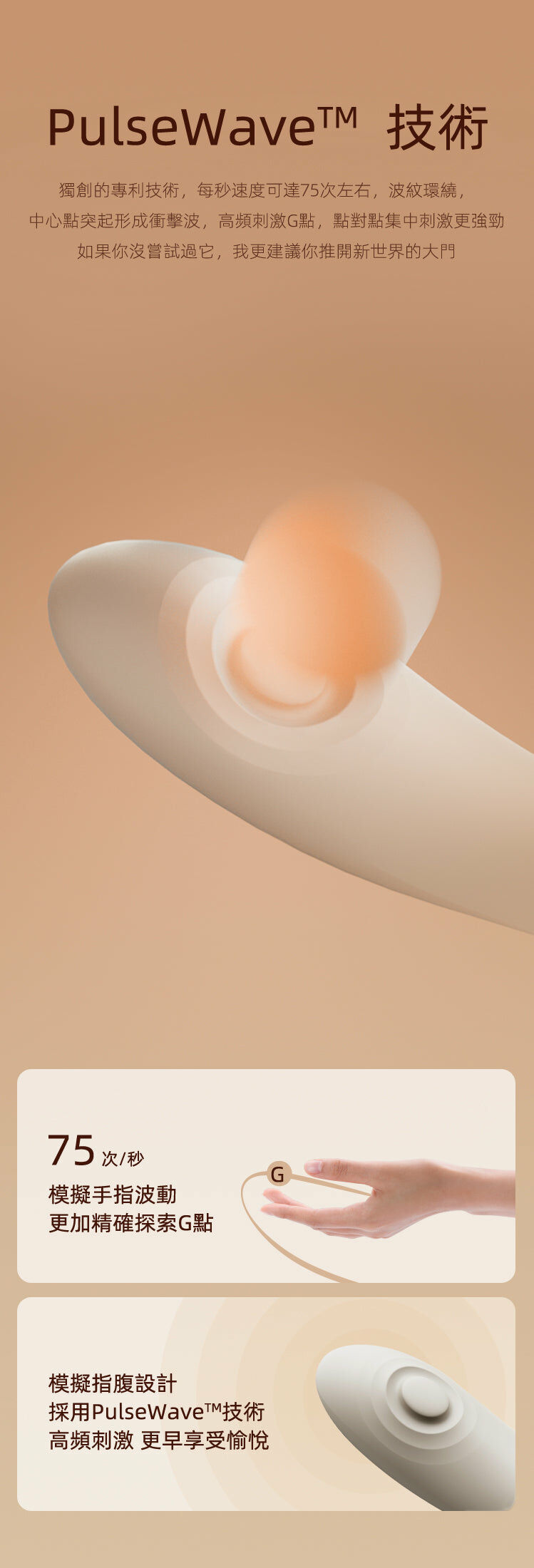 Talis 採用獨創專利 PulseWave 技術,每秒速度可達 75 次左右,中心點突起形成衝擊波,高頻刺激 G 點!加上可拆卸矽膠套,秒變吸啜模式,滿足多種需求,為使用者帶來愉悅的觸感體驗!